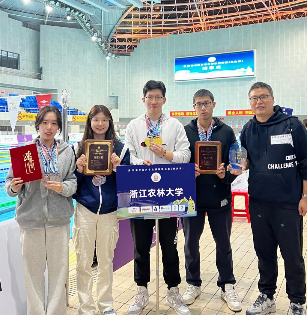 其中,经管学院经管研212班的钱家豪获男子甲组50米蛙泳、100米蛙泳两枚金牌。光机电学院光机电研231班傅瑜峰获男子甲组400米自由泳银牌,200米自由泳铜牌并打破赛会纪录。化材学院家具设计234班林千淇获女子甲组200米自由泳铜牌,200米蝶泳铜牌并打破赛会纪录。经管学院工商管理233班李静毓获女子甲组200米仰泳铜牌,100米仰泳第四名。傅瑜峰、钱家豪、林千淇、李静毓四名队员合力获得了男女甲组4X100米混合泳接力银牌并打破赛会纪录。
