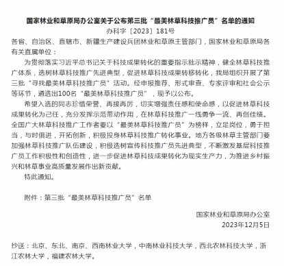 近日,国家林草局公布了全国第三批100名“最美林草科技推广员”名单。浙江省有7位科技工作者获此殊荣,其中包括我校教师1位、我校校友5位。