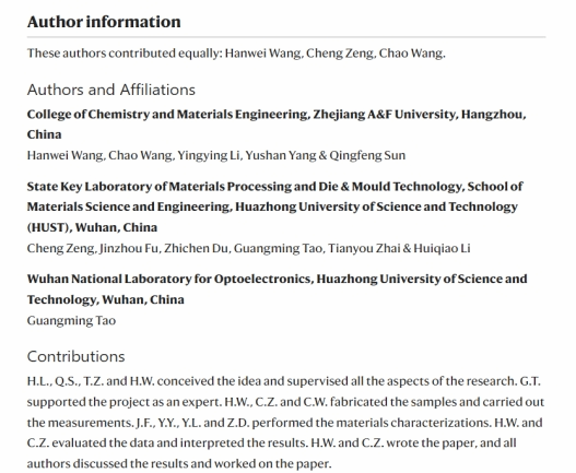 化材学院教师王汉伟、华中科技大学曾诚、化材学院博士研究生王超为该论文的共同第一作者,浙江农林大学为该论文第一单位和通讯单位。