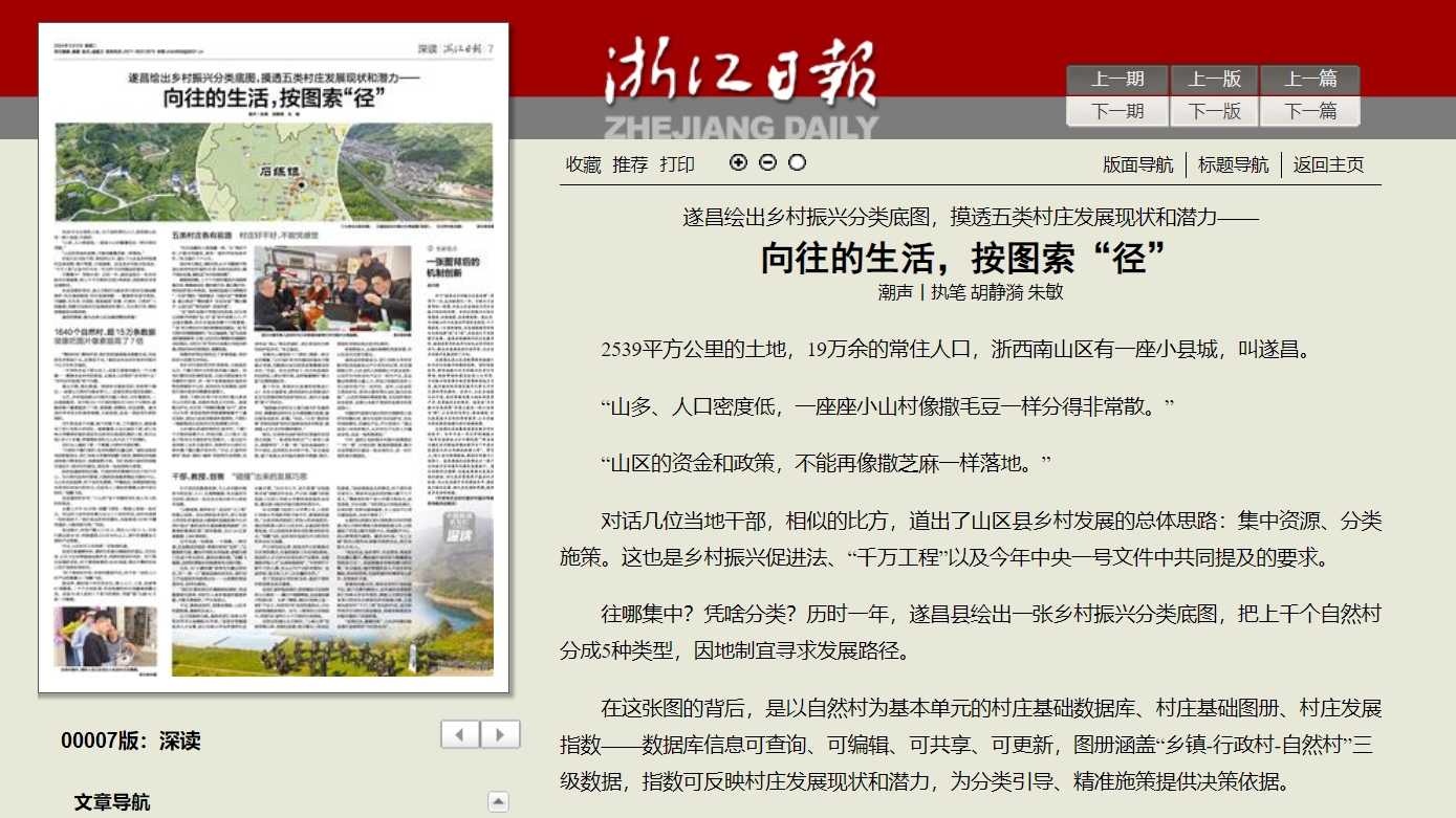 3月5日,《浙江日报》整版刊登《遂昌绘出乡村振兴分类底图,摸透五类村庄发展现状和潜力——向往的生活,按图索“径”》一文,报道了在浙江农林大学技术支持下,经过近一年努力,遂昌县绘制形成了包括“一库一册一图一指数”的乡村振兴分类底图,为乡村分类引导、精准施策,加速实现乡村振兴宏伟蓝图找准有力基点。
