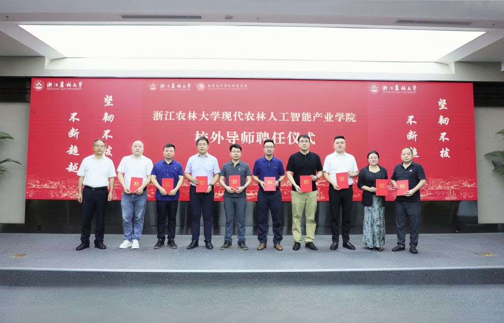 仪式上,举行了省级浙江农林大学现代农林人工智能产业学院校外导师聘任仪式。胡祖吉为产业学院校外导师代表颁发聘书与校徽。