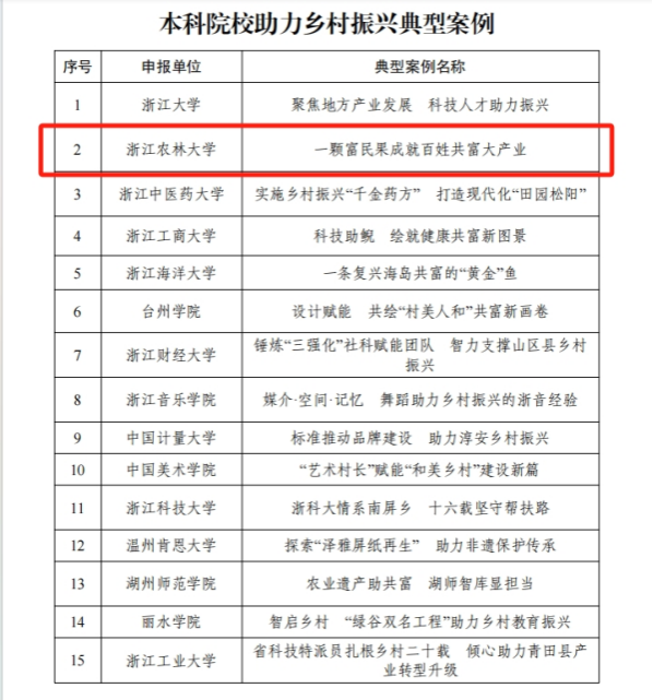 近日,浙江省教育厅发布了第三届高校助力乡村振兴典型案例评选结果。我校推选的《一颗富民果成就百姓共富大产业》成功入选,成为全省15个本科院校助力乡村振兴典型案例之一,这也是我校连续三年获此殊荣。该项目近期还入选了教育助力高质量发展建设共同富裕示范区典型案例。