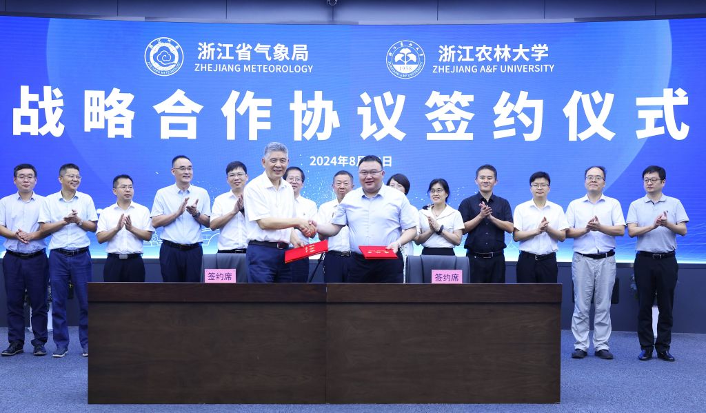 8月28日,浙江农林大学与浙江省气象局战略合作协议签约仪式在杭州举行。浙江省气象局党组书记、局长苗长明,副局长潘劲松;我校党委书记朱斌、副校长吴家胜出席签约仪式。