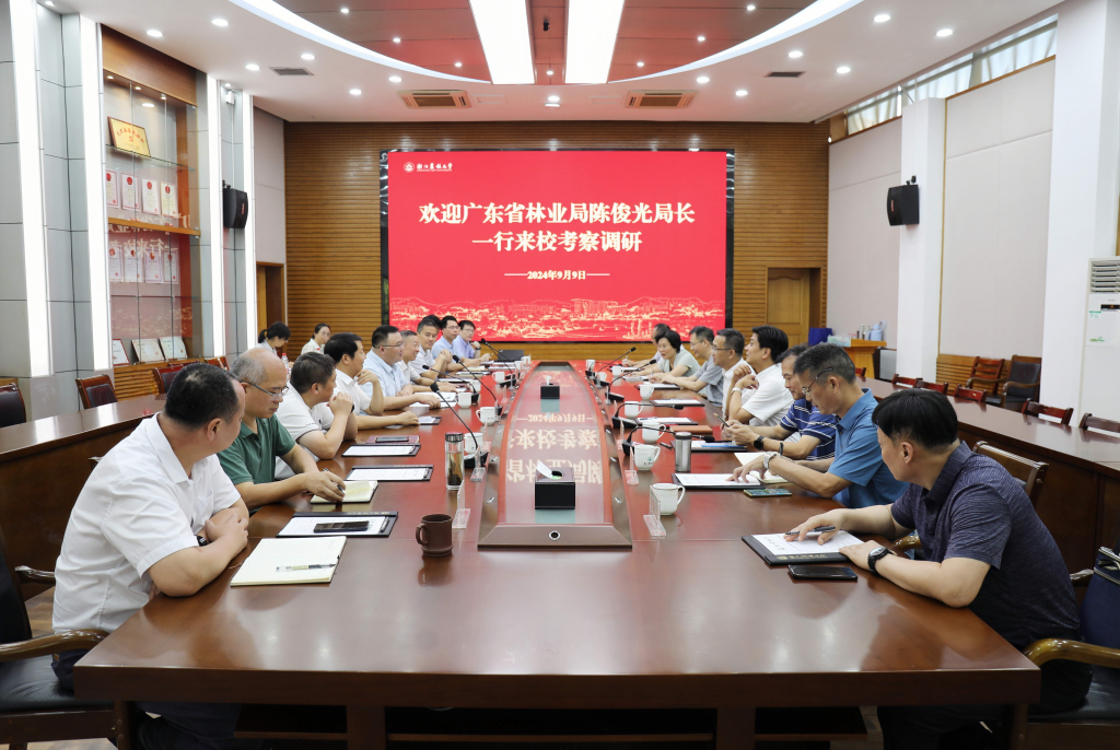 9月9日,广东省林业局局长陈俊光、浙江省林业局副局长李永胜等一行来校考察调研。校党委书记朱斌、副校长吴家胜、校党委原副书记方伟陪同调研。