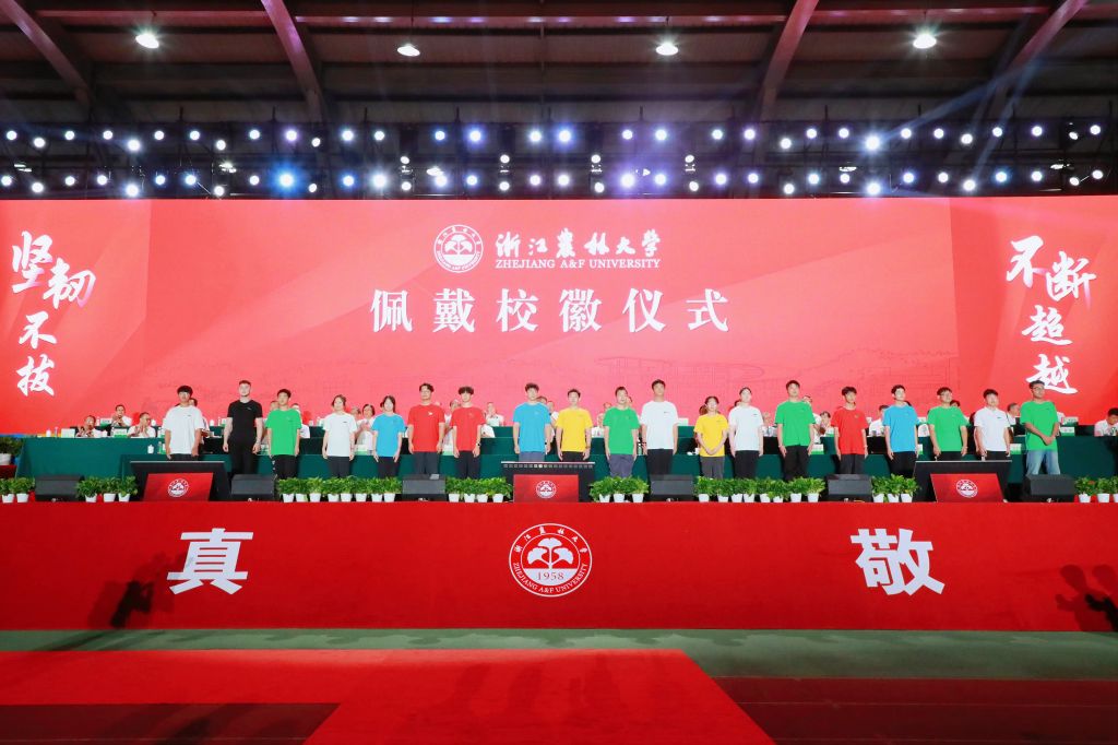 校领导为新生代表佩戴校徽,全体新生共同佩戴校徽。校徽是学校的象征与标识,更是全体学生与教职工的荣耀与自豪。戴上校徽,新生们就永远烙上了浙农林大印记,从此与学校同呼吸、共命运。