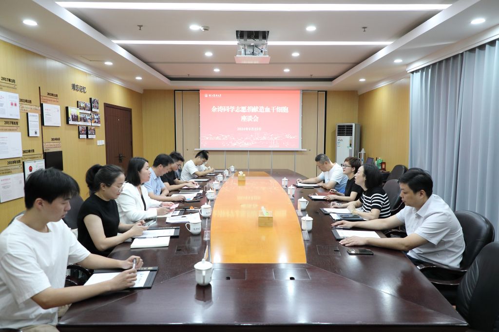 9月23日上午,余涛同学即将出发捐献造血干细胞之前,学校举行了座谈会。校领导对余涛同学的善举表示崇高的敬意和最衷心的感谢,同时鼓励更多的学生参与到社会公益活动中来,培养有担当的新时代青年。