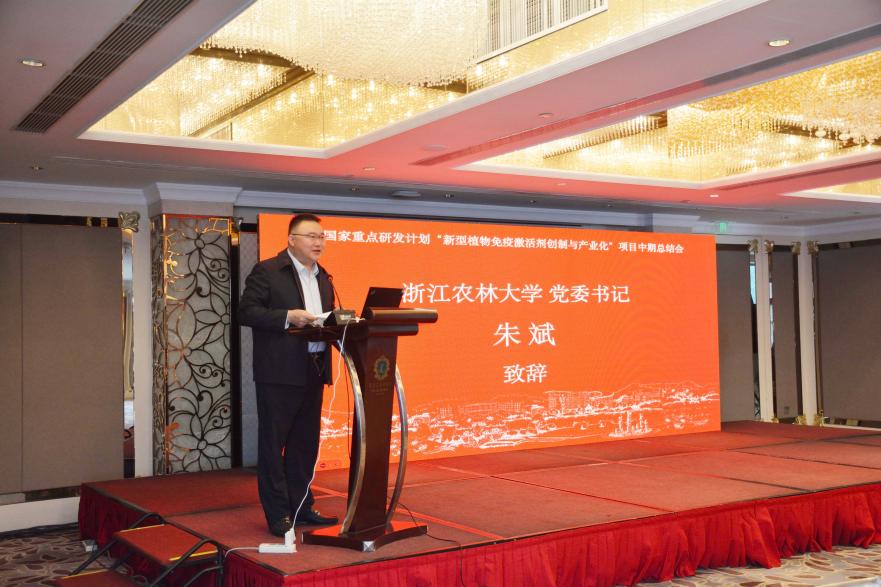 朱斌对与会领导和专家的到来表示欢迎,对农业农村部的关心和指导表示感谢。他指出,“新型植物免疫激活剂创制与产业化”项目对保障我国主粮作物安全、保护生态环境和农业的可持续发展具有重要意义。学校能够参与到项目中并承办此次会议,既是对学校科研实力与组织能力的认可,更是对学校继续深化科研创新、服务国家战略的激励与鞭策。浙江农林大学将一如既往地支持国家重点研发计划项目的实施,为项目团队提供全方位的服务和保障。