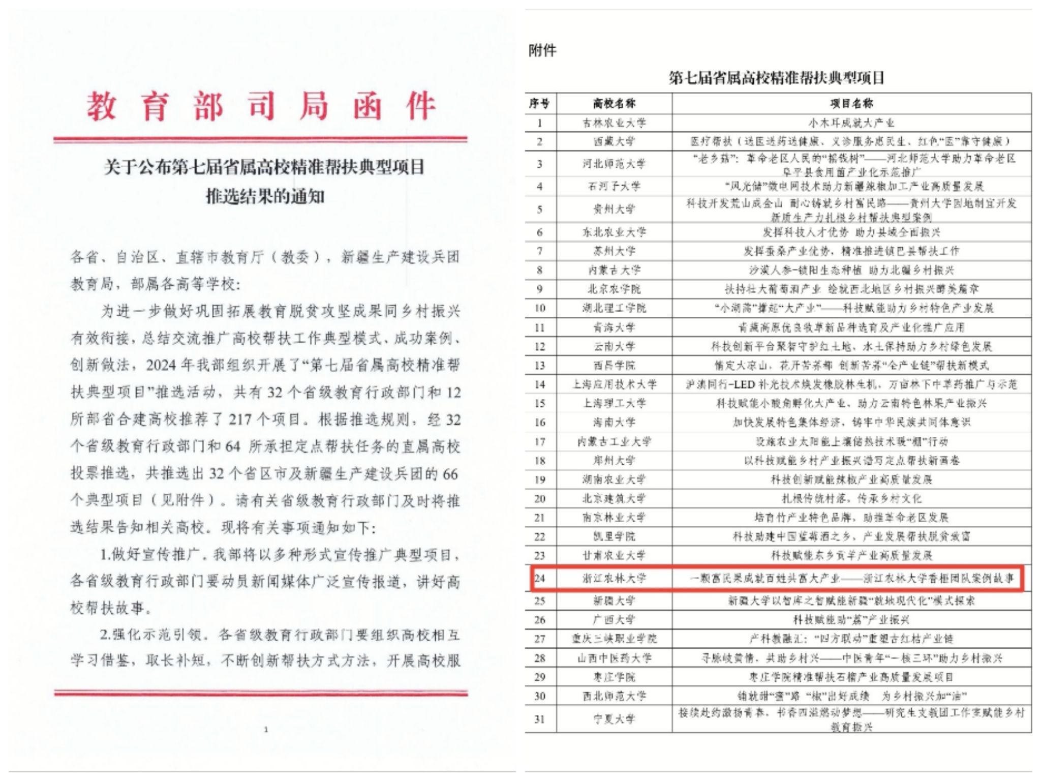 近日,教育部公布第七届省属高校精准帮扶典型项目推选结果,我校报送的《一颗富民果成就百姓共富大产业——浙江农林大学香榧团队案例故事》项目成功入选,这是教育部开展项目推选以来,学校第二次获此成果。