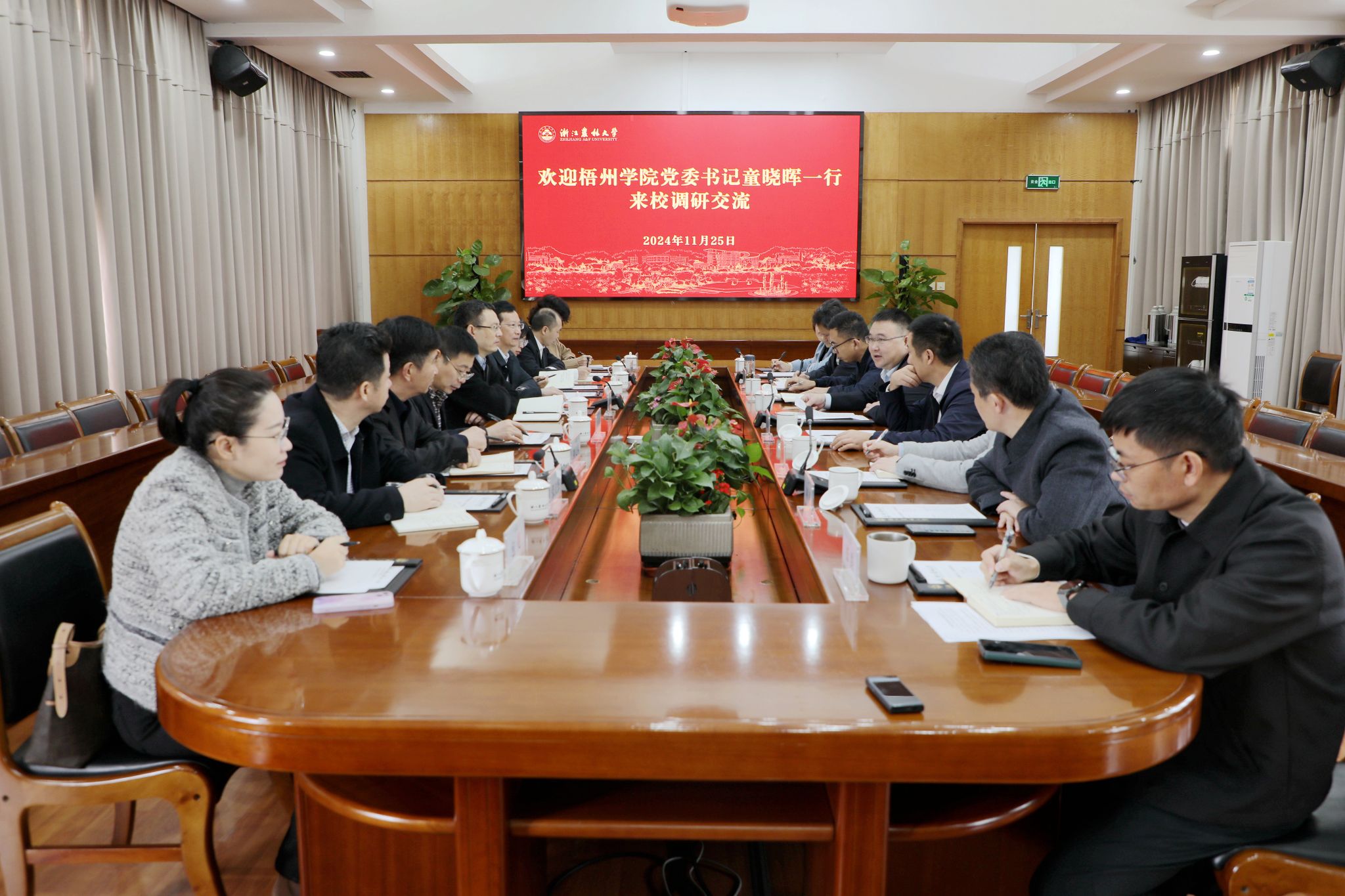 11月25日,梧州学院党委书记童晓晖、副校长麻新纯、纪委书记宾月景一行来校调研。校党委书记朱斌、副校长徐爱俊参加座谈交流。