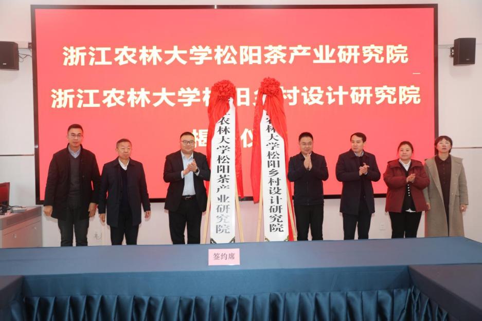 双方举行了浙江农林大学松阳乡村设计研究院签约仪式,共同为浙江农林大学松阳茶产业研究院、浙江农林大学松阳乡村设计研究院揭牌。