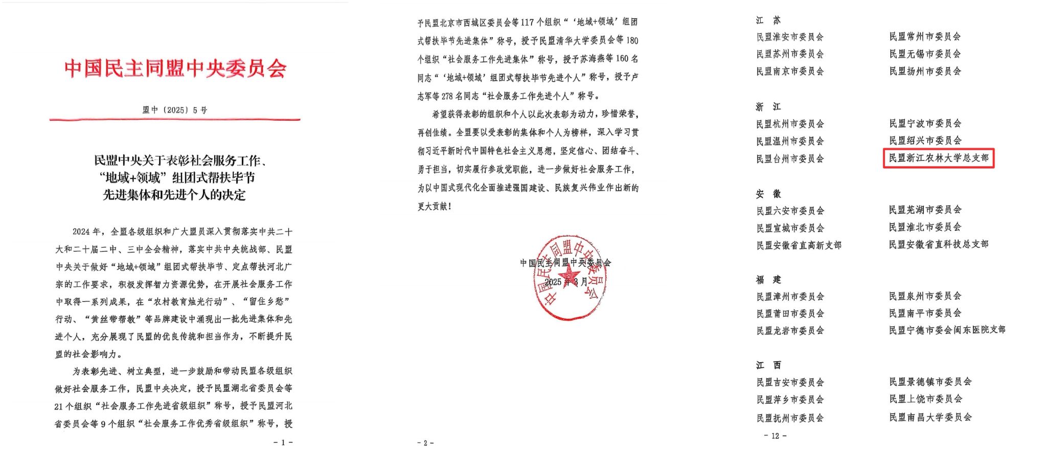 近日,民盟中央召开表彰会议,对社会服务工作、组团式帮扶和定点帮扶工作中表现突出的集体与个人进行表彰。民盟浙江农林大学总支荣获“社会服务工作先进集体”称号,成为浙江省省属高校中唯一获此殊荣的基层组织,充分彰显了其在服务社会、助力乡村振兴等方面所作出的重要贡献。