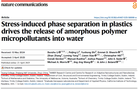 4月23日,暨阳学院李敦柱教授团队在《Nature》子刊《Nature Communications》(中科院1区Top,IF-5yr=16.1)在线发表题为《应力诱导塑料相分离行为及其驱动塑料基微污染物释放行为研究》(Stress-induced phase separation in plastics drives the release of amorphous polymer micropollutants into water)的研究性论文,从分子尺度首次揭示了塑料基材内源性残余应力对塑料降解和微污染物释放的关键性作用机制,有望为高效控制塑料污染提供理论支撑。
