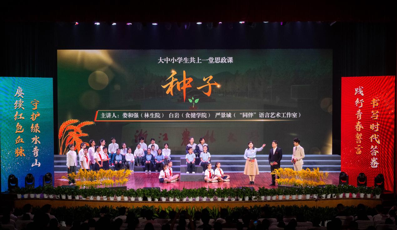 本次活动由宣传部、学工部、研工部、团委主办。临安区教育局、农林大附属中学锦城二中、农林大附小、中国人保财险杭州分公司、建设银行杭州分行等单位代表,学校相关职能部门负责人、二级学院党组织负责人和青年师生代表近1000人参加活动。