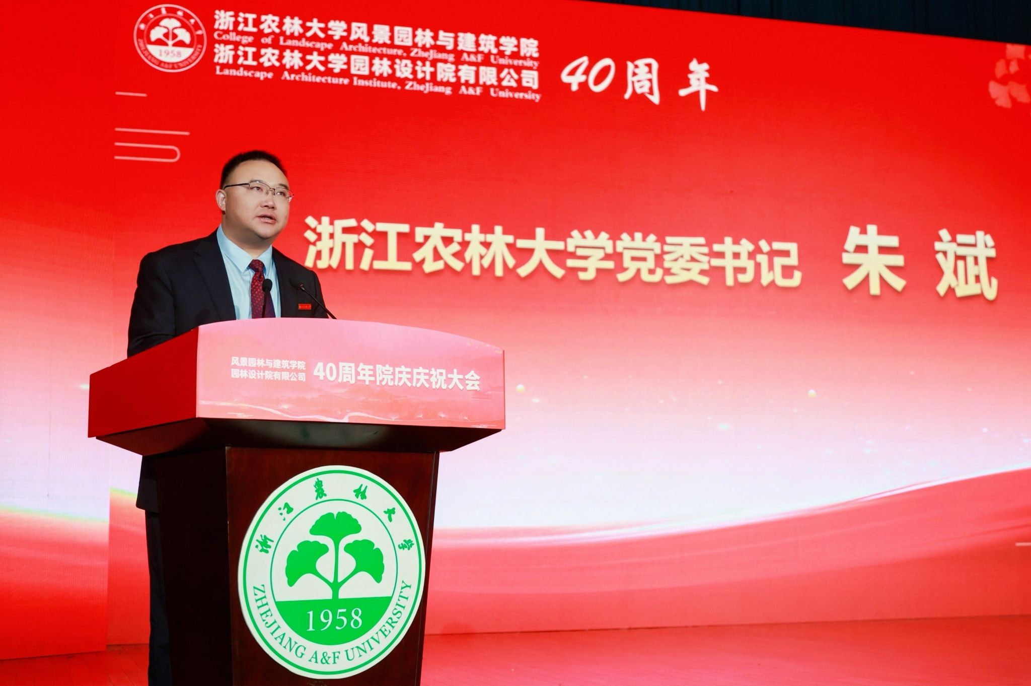 朱斌代表学校致贺词,追溯了园林学院从建系之初的“初心种子”,到成长为国内外具有重要影响力的高水平学院历程。他对学院在立德树人、学科建设、文化传承、社会服务等方面取得的成绩表示肯定,希望学院进一步聚焦人才培养质量、一流学科建设、深化改革创新、强化党建引领、服务乡村振兴,为中华民族伟大复兴贡献园林力量。