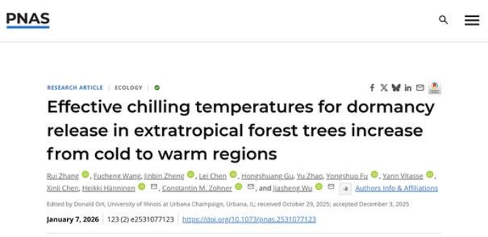 1月7日,浙江农林大学森林食物资源挖掘与利用全国重点实验室香榧团队在国际知名学术期刊《PNAS》(中科院1区Top,IF-5yr=10.6)发表了题为“Effective chilling temperatures for dormancy release in extratropical forest trees increase from cold to warm regions”(《树木休眠解除有效积冷温度从寒冷至温暖地区递增》)的研究论文。