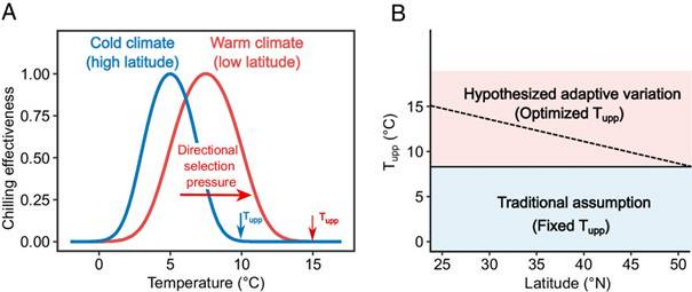 该研究结合大规模跨纬度试验与物候观测大数据,首次证实了树木休眠解除的有效积冷阈值(Tupp)存在显著的纬度梯度差异,揭示香榧等南方树木Tupp显著高于北方树木,修正了物候学界长期沿用的“固定积冷范围”经典理论,为森林食物资源树木应对气候变化及生态适应型品种培育提供了关键理论依据。