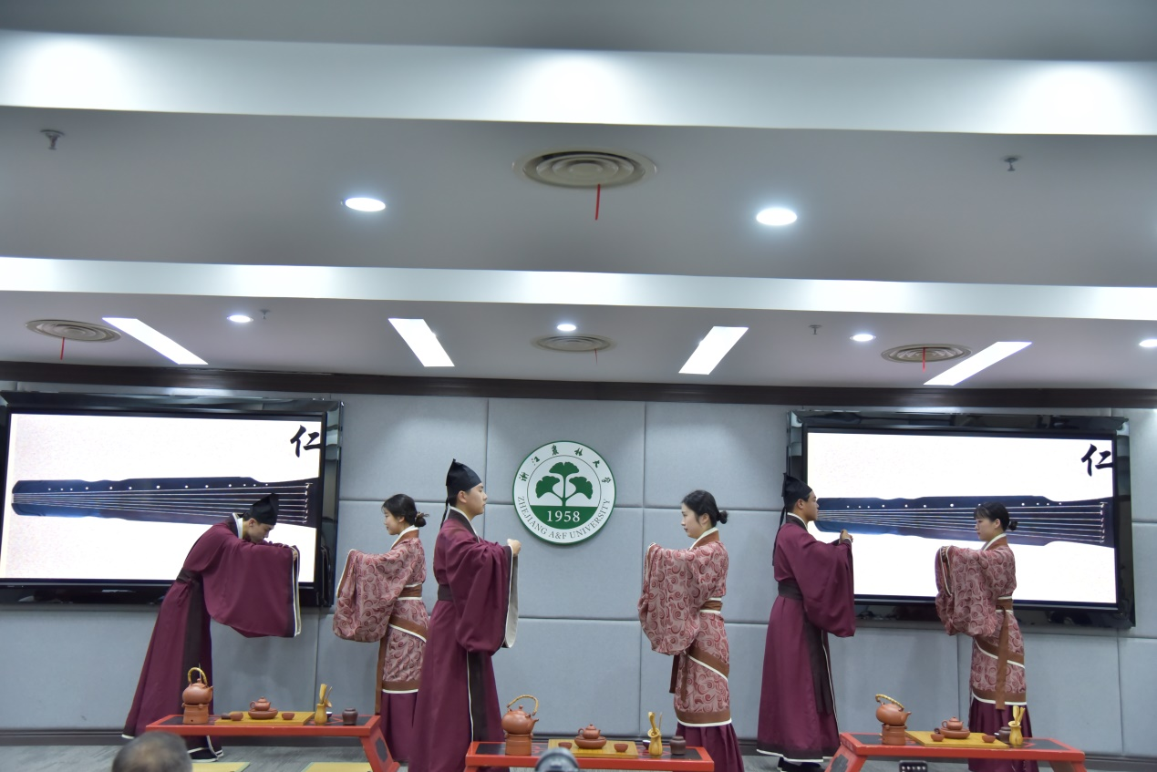 茶学与茶文化学院院长童再康作为东道主致欢迎辞,并奉上迎客茶。茅盾文学奖得主、我校茶学与茶文化学院名誉院长、汉语国际推广茶文化传播基地主任王旭烽教授在开幕式中致辞。