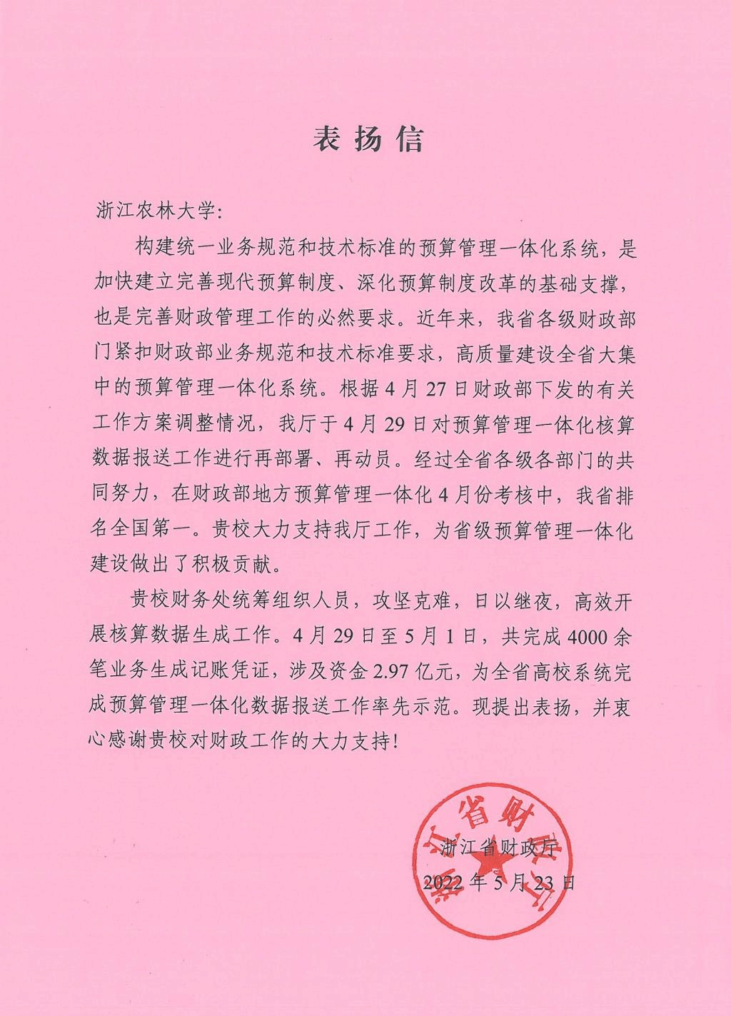 近日,我校收到浙江省财政厅表扬信。表扬信肯定我校在预算管理一体化核算数据报送工作中高效开展核算数据生成工作,为全省高校系统完成预算管理一体化数据报送工作率先示范,为省级预算管理一体化建设做出了积极贡献。