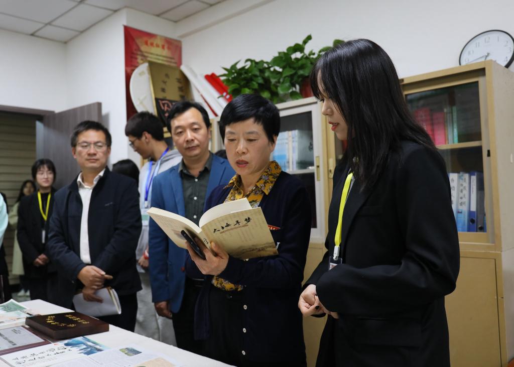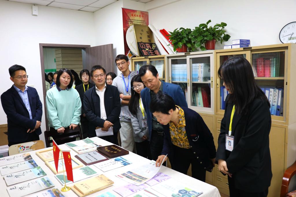 校学生通讯社社长项诗瑶为施美红一行展示了通讯社采访调研集《大地寻梦》、校园杂志《追梦人》和《军训简报》等纸质刊物,介绍了通讯社举办的记者节、闪亮新主播语言主题大赛等品牌活动。