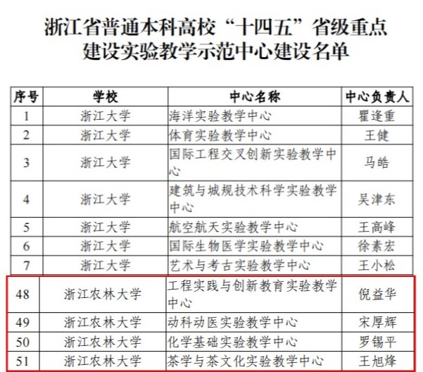 近日,浙江省教育厅办公室发布《关于公布普通本科高校“十四五”省级重点建设实验教学示范中心和省级大学生校外实践教育基地立项建设名单的通知》(浙教办函〔2023〕41号),我校组织申报的“工程实践与创新教育实验教学中心”、“动科动医实验教学中心”、“化学基础实验教学中心”、“茶学与茶文化实验教学中心”四个实验教学中心成功获得立项建设。截止目前,我校建有国家级实验教学示范中心1个,省级重点建设实验教学示范中心8个,省级实验教学示范中心5个,实现全校每个实验教学单位都建有省级实验教学示范中心,做到省级实验教学平台全覆盖。