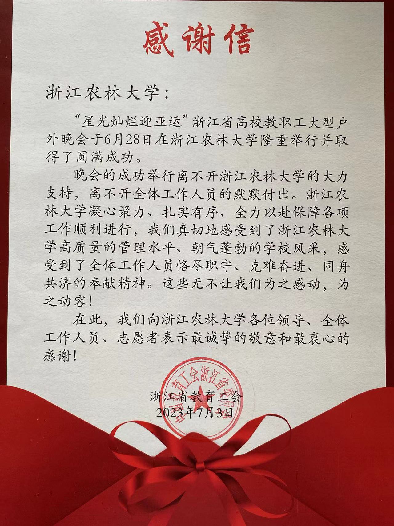 省教育工会在感谢信中指出,晚会的成功举行离不开浙农林大的大力支持和全体工作人员的默默付出,也体现了学校高质量的管理水平、朝气蓬勃的风采和全体工作人员恪尽职守、克难奋进、同舟共济的奉献精神。