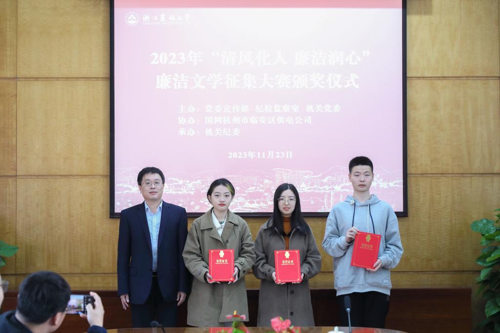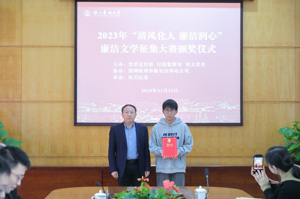 11月23日,2023年浙江农林大学“清风化人 廉洁润心”廉洁文学征集大赛颁奖仪式在东湖校区行政楼第一会议室举行。
