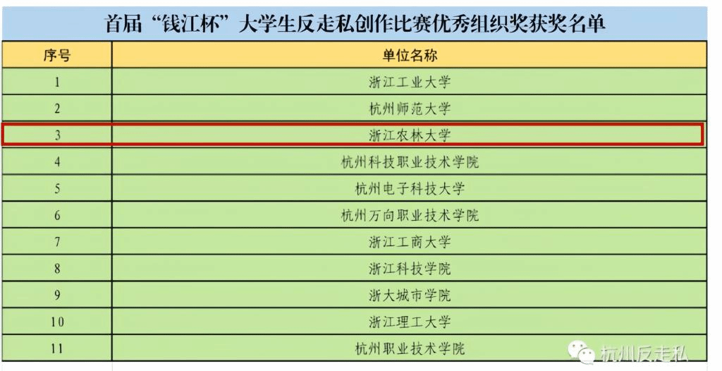 近日,第二届全国大学生反走私创作大赛获奖名单、首届“钱江杯”大学生反走私创作比赛获奖名单先后公布。在第二届全国大学生反走私创作大赛中,我校获高校组优秀组织奖,3件学生作品获优秀奖,郭冰老师获优秀指导教师奖。在首届“钱江杯”大学生反走私创作比赛中,我校获优秀组织奖,文法学院谭解等创作的《反走私风云》获得视频类作品三等奖,另有11件学生作品获优秀奖,郭冰、周雪峤2名老师获优秀指导教师奖。