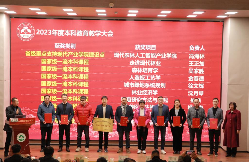 会议表彰了从事本科教学管理工作满十五周年教师、优秀教务人员、校优质教师(红虹奖、一等奖)、浙江农林大学大学生创新创业大赛优秀指导教师团队、浙江省教师教学创新大赛、高校青年教师教学竞赛获奖者、校教学成果奖获奖团队、国家级一流课程、专业认证。为获得省级重点支持现代产业学院建设点授牌。
