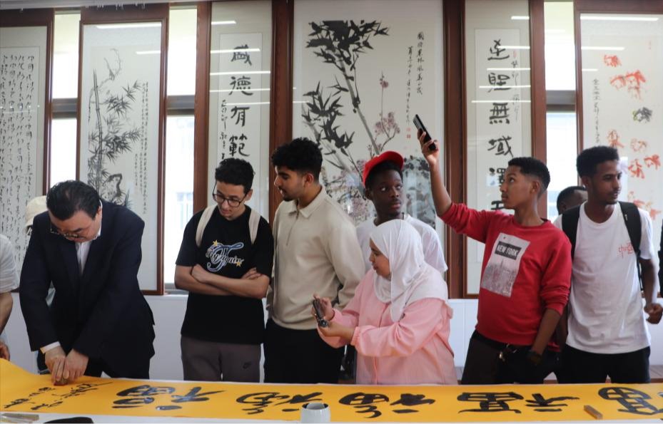 交流会后,艺术家为留学生们讲授了中国书法技法,并现场挥毫创作,展示了中国书法的独特魅力。在场的留学生惊叹于艺术家们的精湛技艺,纷纷拿起手机拍照,深深陶醉在硬笔书法的艺术世界之中。