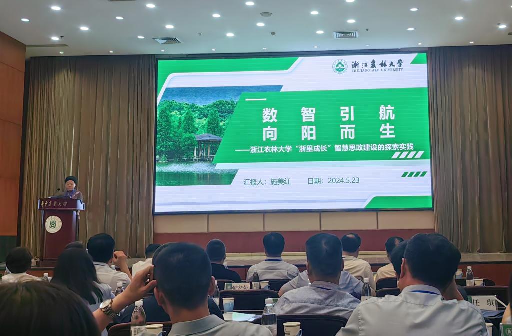 施美红围绕我校智慧思政工作,作了题为《数智引航 向阳而生——浙江农林大学“浙里成长”智慧思政建设的探索实践》的经验交流报告。她从建设基础、建设内容和建设成效等方面,系统介绍了我校“一库一表一次”建设工程以及“浙里成长”智慧思政平台建设,报告内容得到与会代表的热烈讨论和高度认可。