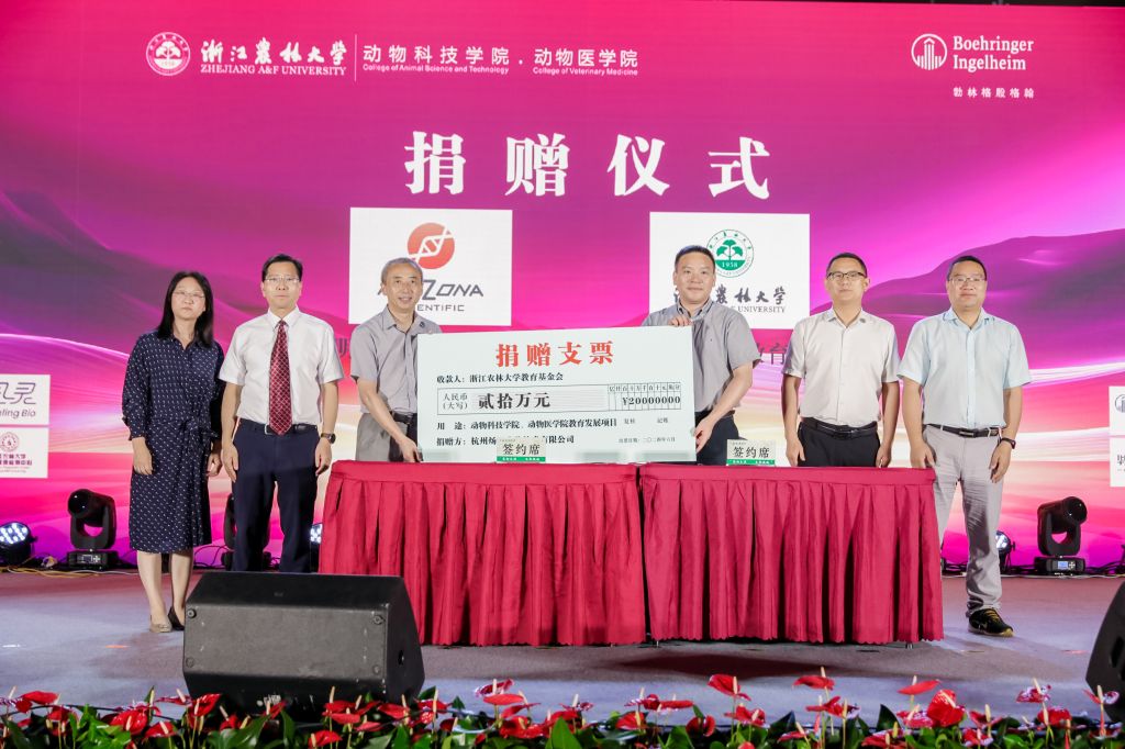 6月17日,杭州炀明生物技术有限公司捐赠仪式在东湖校区风雨操场体育馆举行。副校长、校教育基金会副理事长胡祖吉,校党委委员、动科动医学院院长宋厚辉,炀明生物创始人刘建忠、曹雪梅,以及我校校友办、国际处、组织部相关负责人和企业代表、动科动医学院师生代表参加仪式。