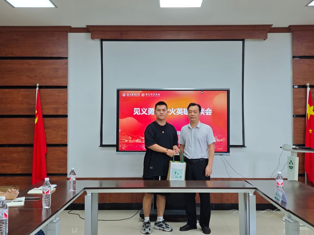 倪建均高度肯定了李之博同学的英勇事迹,并向他赠送了学校文创产品。倪建均指出,李之博同学面对紧急情况挺身而出,不惧危险,勇气可嘉,是当代大学生勇于担当的生动体现。救火期间,李之博结合自身在部队、学校所学的专业知识,保护了人民生命财产安全,有勇有谋,体现了青年学子的智慧与担当,展示了我校教书育人的良好形象。