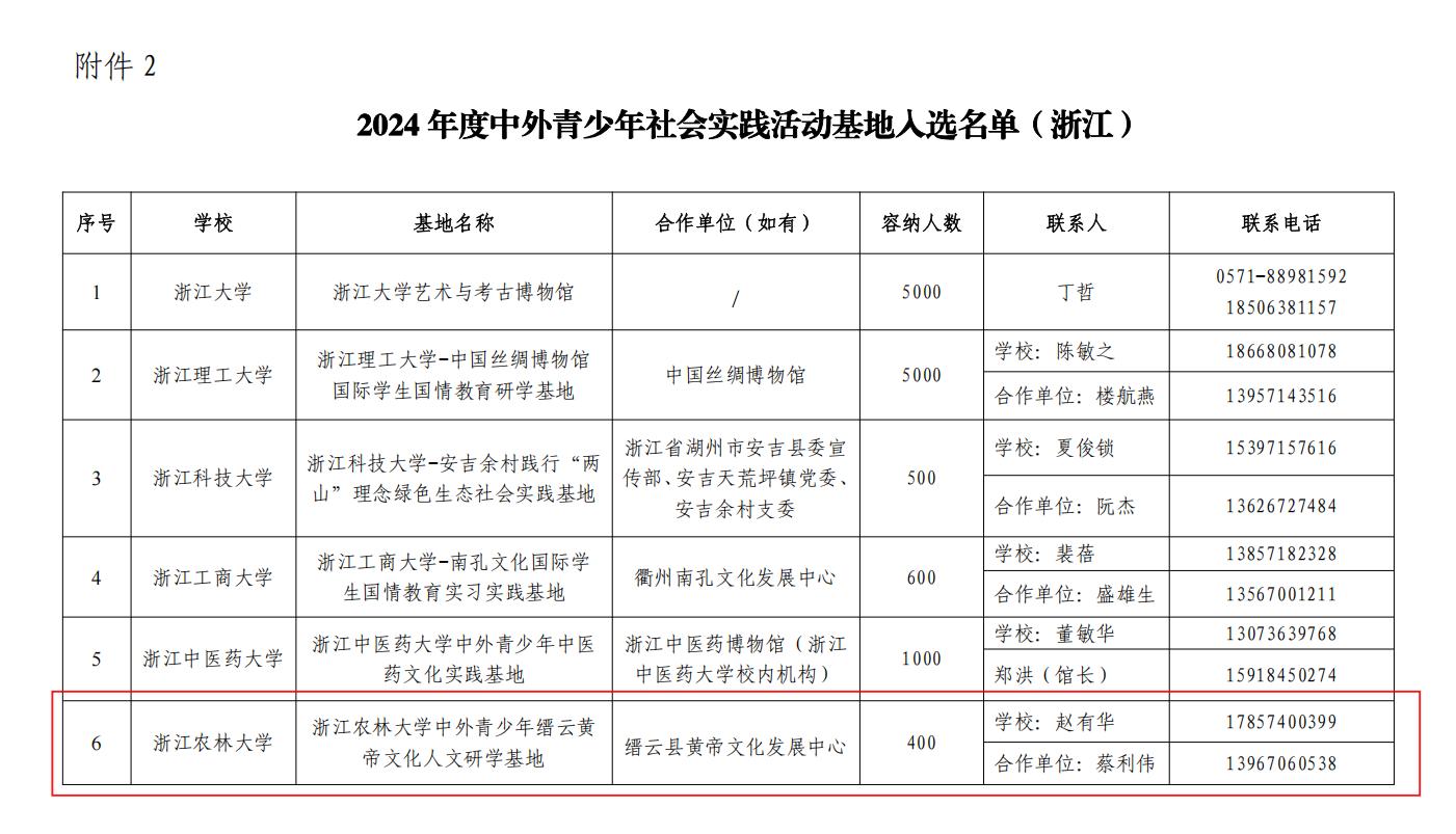 近日,浙江省高等学校国际学生教学指导委员会下发《关于公布2024年度来华留学中国国情教育优秀课程和中外青少年社会实践活动基地入选名单(浙江)的通知》,由教育部国际合作与交流司委托、中国教育国际交流协会组织的全国首批来华留学生中国国情教育优秀课程和中外青少年社会实践活动基地征集工作结果揭晓。我校与缙云县黄帝文化发展中心合作申报的“浙江农林大学中外青少年缙云黄帝文化人文研学基地”入选,成为全国首批115个中外青少年社会实践活动基地之一,标志着我校国际学生国情教育的校地合作迈出了重要一步。