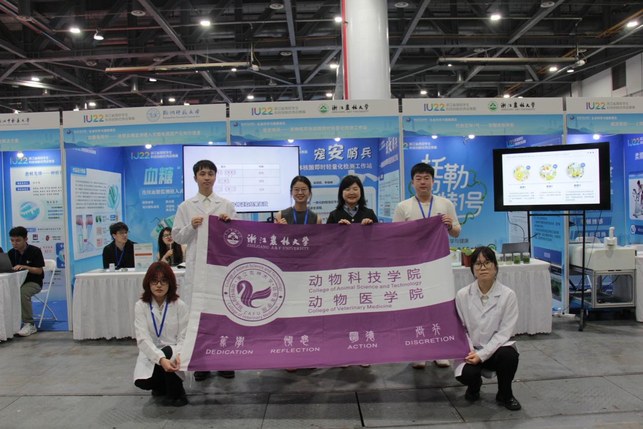 来自动科动医学院《宠安哨兵一宠物病原体核酸即时轻量化检测工作站》、园艺学院《托勒忍特1号——猕猴桃新种质》、艺术学院《凤鸣智语”数智人一体式交互系统》、数计学院《高通量植物表型检测装置(转盘式)》等4支学生团队的科技项目,也在“IU22浙江省高校学生科技创新优秀成果展览区”进行了展示。