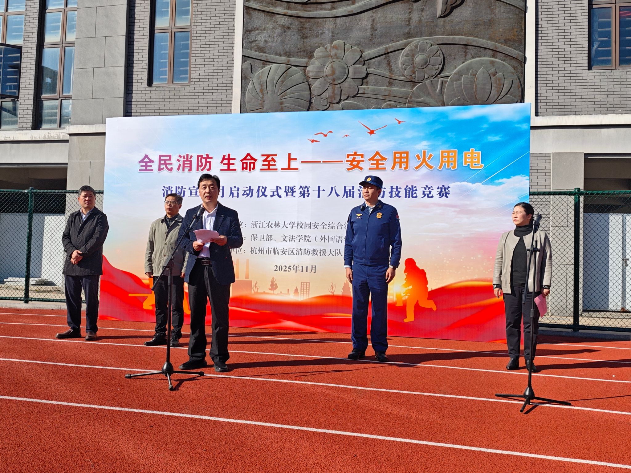 11月13日下午,消防宣传月启动仪式暨第十八届消防技能竞赛在衣锦校区田径场拉开帷幕,本次宣传月活动的主题是“全民消防、生命至上-安全用火用电”,校党委副书记倪建均、临安区消防救援大队参谋张恒、校保卫部部长吴青林、文法学院副书记(主持工作)徐达出席启动仪式,启动仪式由文法学院相关负责人主持。来自全校20支参赛队伍、师生员工代表500余人参加。