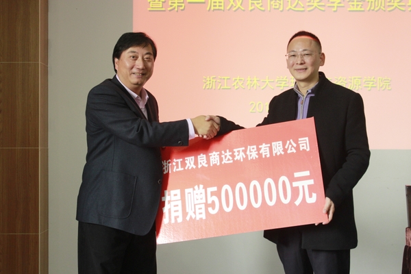 据悉,浙江双良商达环保有限公司的捐赠主要用于建设“浙江农林大学——双良商达联合实验室”和设立企业奖学金。其中,联合实验室包括200平方米的标准实验室、300平方米的室外检测(实训)基地,将根据双方发展需要及市场需求进行合作研究,将其打造为教学实践平台、横向推广平台、院士工作站研究平台和社会化服务平台。企业奖学金经学院1:1配套后,基金数共计20万元,主要用于奖励德智体全面发展,创新实践能力显著,发展潜力突出,立志为我国环境资源保护和现代农林业发展服务的优秀学生。