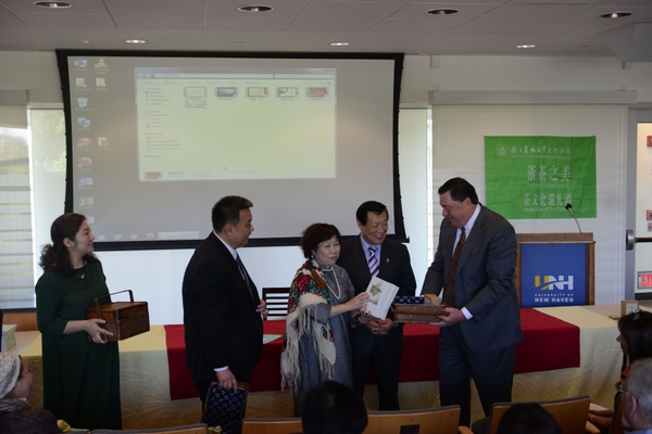 茶是平和而又美好的象征,纽黑文大学与浙江农林大学因茶结缘,在互换礼物的环节,自然少不了茶的身影。王旭烽教授的《茶人三部曲》、浙江农林大学的"笨鸟"茶宠以及来自浙江的五款绿茶(西湖龙井,安吉白茶,天目青顶,开化龙顶和金奖惠明)被装进极具中国特色和富有人文气息的竹篮中,留在了纽黑文大学。喜爱中华茶文化的李昌钰向“浙茶之美”茶文化巡礼团队员赠送了签名卡片,That Henery赠送了学校的纪念礼物。