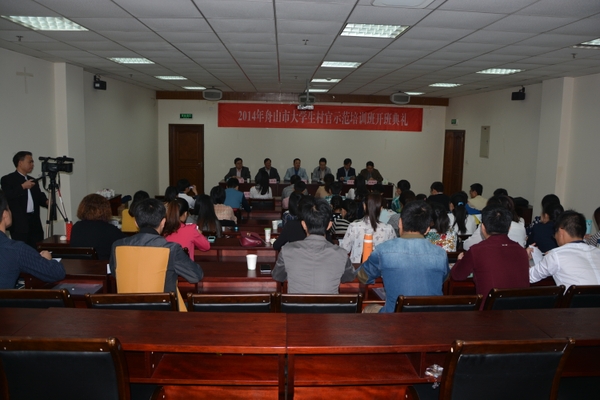 10月28日上午,2014年舟山市大学生村官示范培训班开班典礼在我校东湖校区活动中心举行,此次培训为期5天,由舟山市委组织部和我校村官学院联合举办。校党委副书记、村官学院院长余杰,舟山市委组织部人才处副处长赵华,法政学院院长、村官学院常务副院长王长金,法政学院、学工部、校团委相关负责人以及舟山各区、县委组织部相关人员出席了本次活动,舟山市40名大学生村官代表参加了本次典礼。