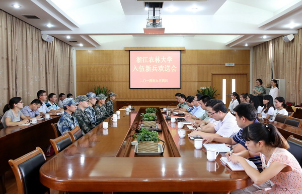9月4日下午,我校入伍学生欢送会在行政楼第一会议室举行。校党委副书记余杰,校党委委员、宣传部部长陈永富,临安市人武部副部长卢江,学工部、人武部、相关学院负责人,相关辅导员和6名入伍学生及家长代表参加了本次活动。