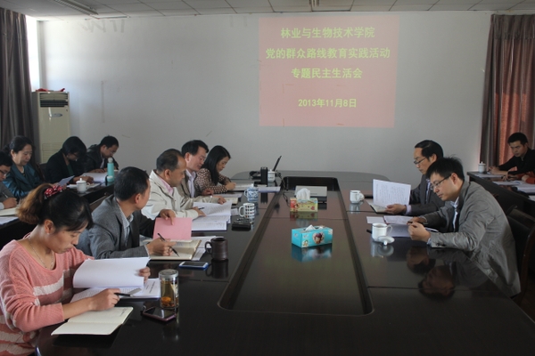 根据学校党的群众路线教育实践活动的安排部署,11月8日全天,林业与生物技术学院党委班子召开专题民主生活会。校长周国模、校党委组织部部长童晓晖出席会议。学院党委班子全体成员,分工会、学科(中心、两办)负责人,教工党支部书记,辅导员,学生代表等20余人参加会议。