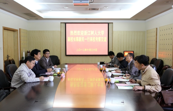 浙农林大新闻网讯 10月30日上午,浙江树人大学副校长陈新民一行5人来校考察交流。我校副校长鲍滨福与客人们进行了座谈,并向客人介绍了学校概况以及近年来的改革发展和建设情况。双方主要就硕士点申报和科研工作情况等主题进行了深入探讨和广泛交流。