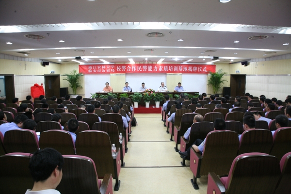 浙农林大新闻网讯 6月8日下午,我校与临安市公安局“校警合作”民警能力素质培训基地揭牌仪式在东湖校区第二报告厅举行,副校长王自勇,临安市委常委、公安局长李建明,杭州市公安局教育训练处处长金跃平,临安市公安局党委副书记、政委吴勤校,继续教育学院院长朱永法等领导出席揭牌仪式,来自临安市公安系统科所队长以上各级指挥人员和有关民警120余人参加了揭牌仪式。仪式由吴勤校主持。
