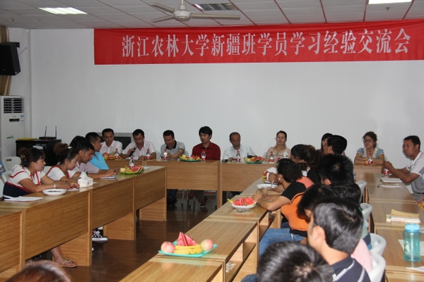 浙农林大新闻网讯 5月21日晚,新疆班新老学员学习经验交流会在活动中心104举行。阿克苏地区赴浙江省培养工作副总领队艾斯卡尔,第一批新疆班管理人员史玉、阿孜古丽,四名优秀学员代表,第二批新疆班管理人员、培养学员百余人参加了座谈会。