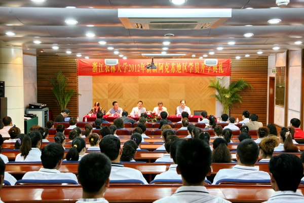 浙农林大新闻网讯 4月27日上午,我校2012年新疆阿克苏地区学员开学典礼在活动中心举行。校党委副书记余杰、副校长王自勇,新疆阿克苏地区普通高校毕业生赴浙江省培养工作副总领队王星、赴我校领队张平出席开学典礼。学校相关职能部门和学院(部)负责人,新疆阿克苏地区来校学习的学员、带队辅导员等百余人参加了典礼。典礼由学工部部长张敏生主持。
