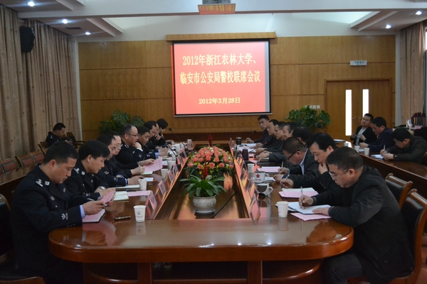 浙农林大新闻网讯 3月28日下午,学校与临安市公安局在行政楼第一会议室召开联席会议,副校长王自勇主持并讲话。临安市公安局局长李建明出席,副局长李家华及相关部门负责人,校办、学生处、校园建设与管理处、公共事务管理处、保卫处、后勤集团负责人参加了会议。