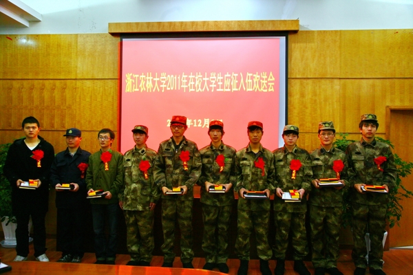 汪志银代表校党委、行政及全体师生员工,对即将奔赴军营的10名同学表示衷心的祝贺。希望同学们要牢记胡锦涛主席对军队建设的重要指示,热爱军队,在军营中磨练自己,做一名献身军队建设事业的革命战士;希望同学们发扬“坚韧不拔,不断超越”的浙农林大精神,尽快完成从普通大学生到合格军人的角色转变,将自己的才学知识应用到国防建设上,为母校争光;希望新兵同学们今后能刻苦训练,以金光闪闪的军功章来回报祖国、回报人民、回报亲人、回报母校。