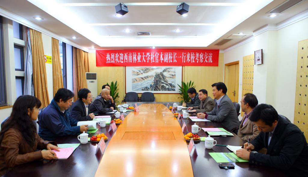 浙农林大新闻网讯 11月30日下午,西南林业大学副校长杜官本与中国林科院相关领导和专家一行5人来校考察交流。我校副校长鲍滨福接待了来宾,并与客人们进行了座谈。鲍滨福对杜官本一行的到来表示热烈欢迎,并介绍了学校的建设和发展情况。会上,双方就科研工作和学科建设等相关情况进行了深入的探讨交流。