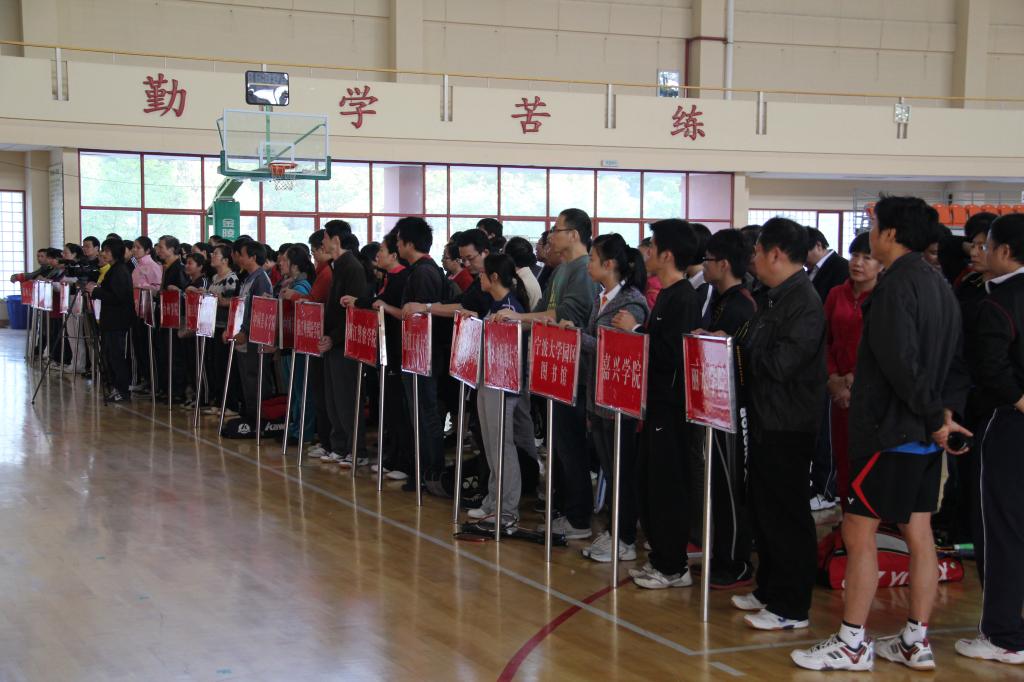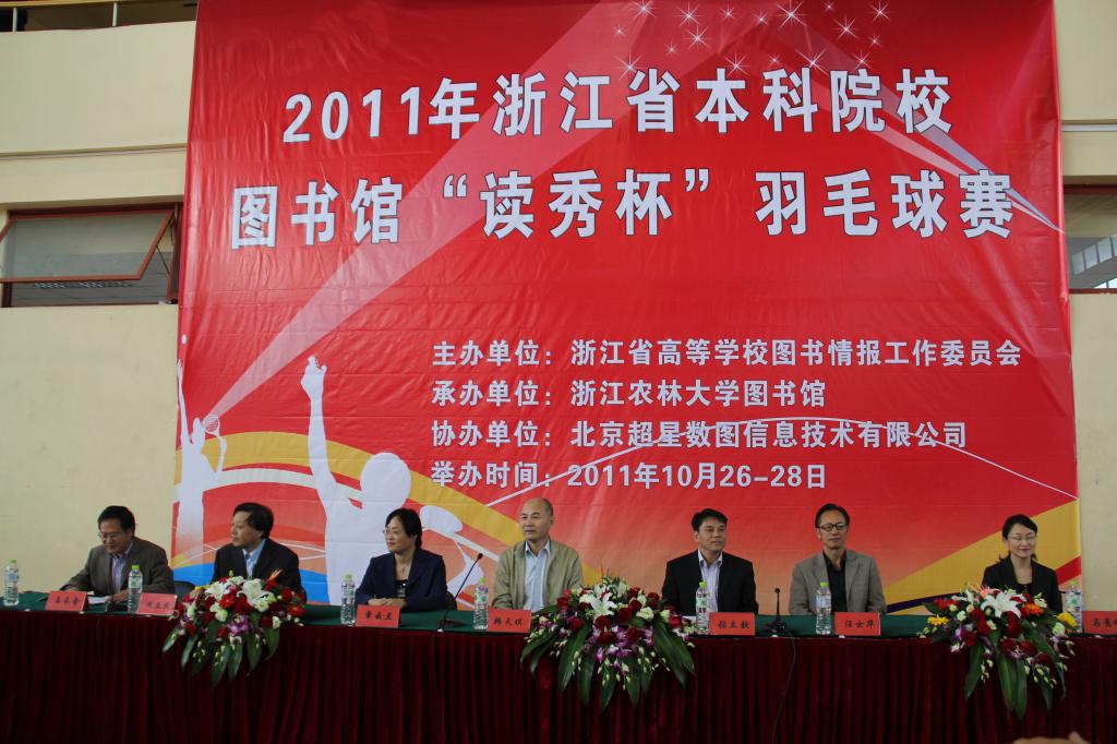浙农林大新闻网讯 十月的浙农林大,秋高气爽,硕果飘香。10月27日上午,由我校承办的2011年浙江省本科院校图书馆“读秀杯”羽毛球赛在我校篮球馆羽毛球赛场拉开序幕。浙江省教育厅高教处副处长韩天琪,浙江农林大学副校长张立钦,浙江省高校图工委副主任兼秘书长、浙江大学副馆长章云兰,浙江农林大学党委委员、工会主席汪士华,浙江省高校图工委副主任、浙江工业大学图书馆馆长何立民,浙江省高校图工委副主任、浙江大学副馆长马景娣,及来自全省26支代表队的130余名运动员参加了开幕式。开幕式由图书馆馆长、现代教育技术中心主任王长金主持。