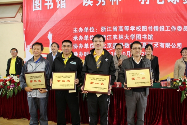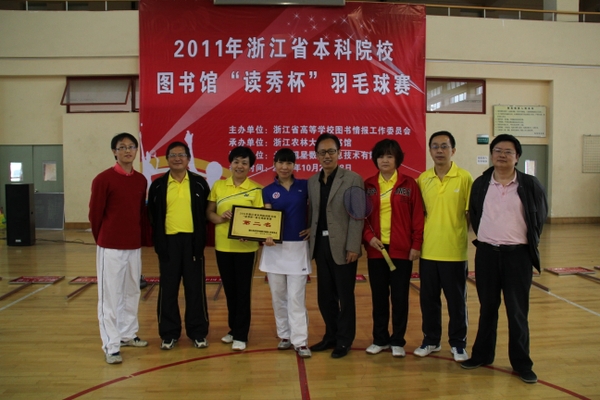 浙农林大新闻网讯 10月28日中午, 2011年浙江省本科院校图书馆“读秀杯”羽毛球赛在我校风雨操场落下帷幕。经过两天的激烈角逐,浙江农林大学代表队奋勇拼搏,以娴熟的技术配合和成功的战术安排,夺得“团体赛”第二名,第一名和第三名分别由浙江师范大学、湖州师范学院和浙江科技学院代表队获得。