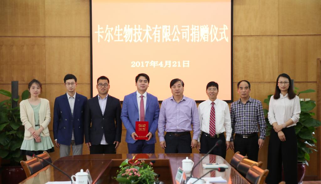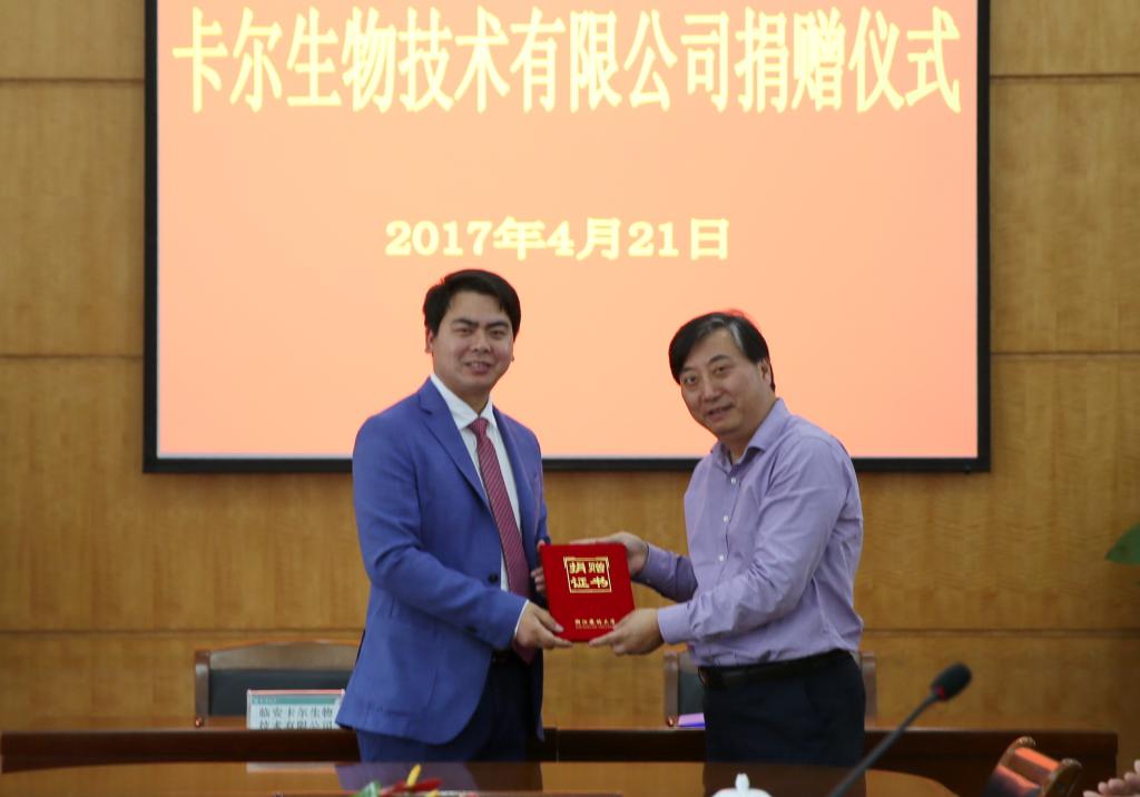 金佩华为卡尔公司颁发了捐赠证书。他指出,校友是学校发展中最宝贵的资源,作为我校2011届优秀校友,林高昂董事长将个人发展与学校发展联系起来,与动科院建立起良好的合作关系。他用“三个最”概括了本次捐赠的特殊意义,要求相关部门和受赠学院要使用好款项,服务好校友,宣传好故事。